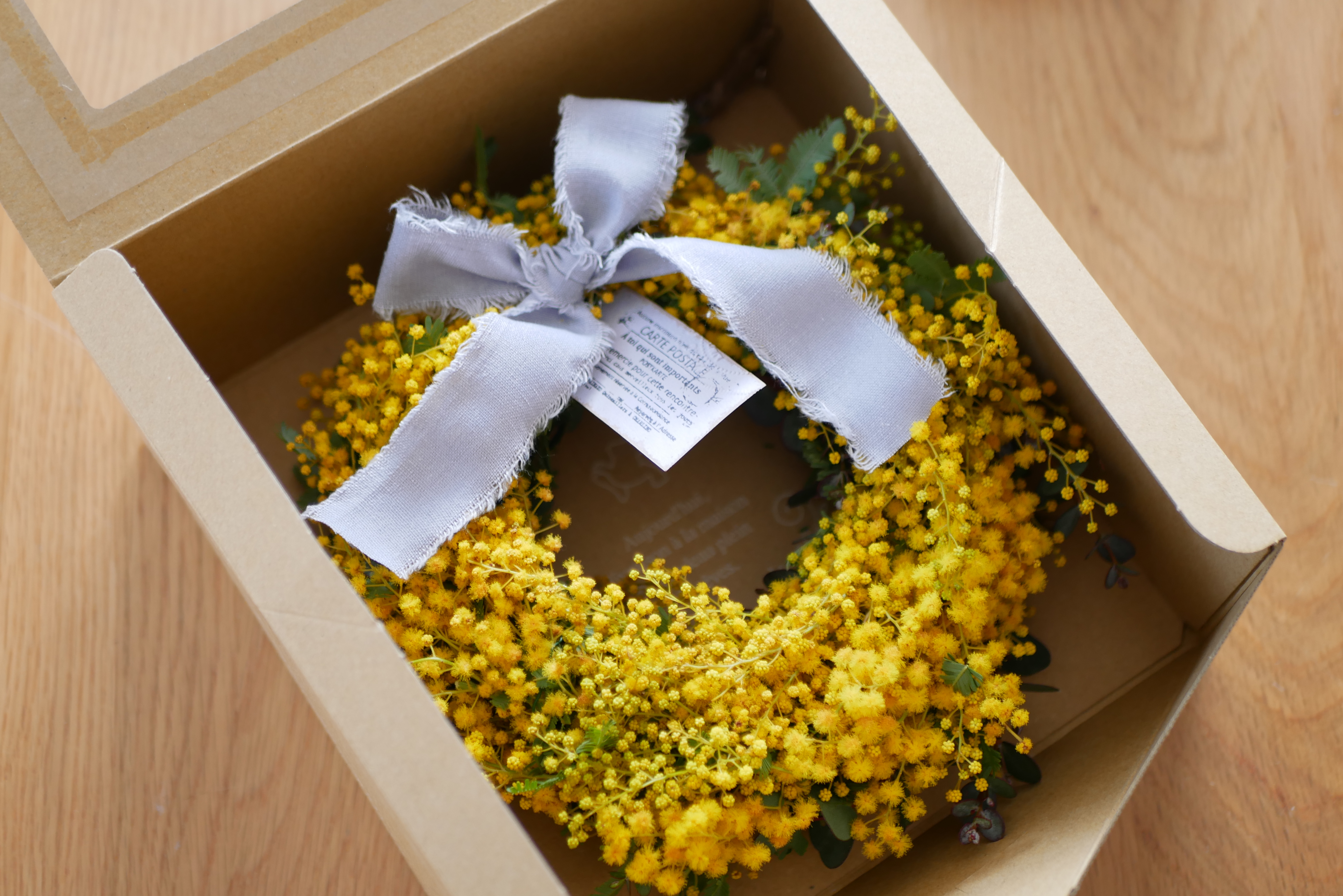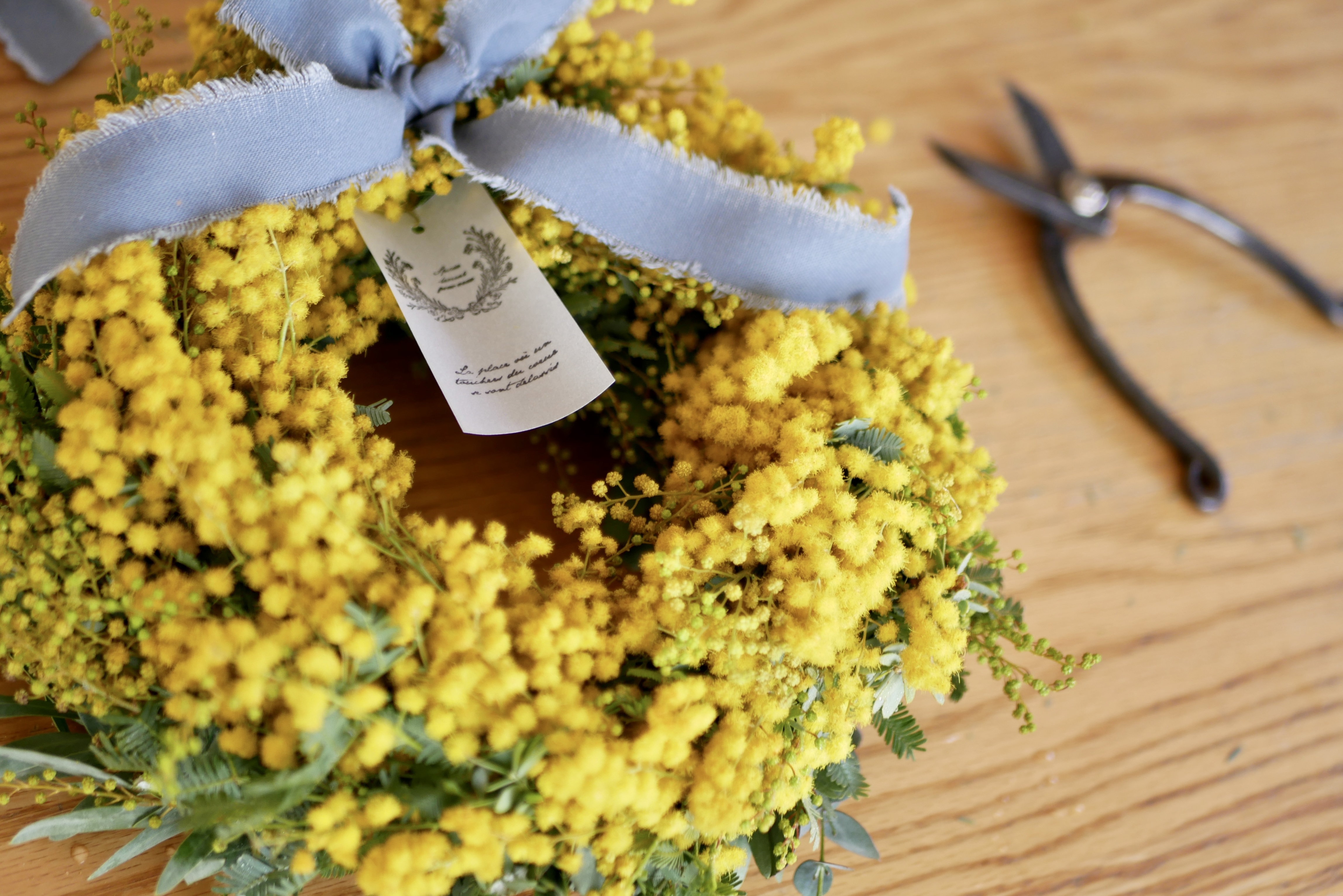 特に国産ミモザと輸入ミモザでは花の大きさなども違います。その花に合ったリースの組み方を致します。